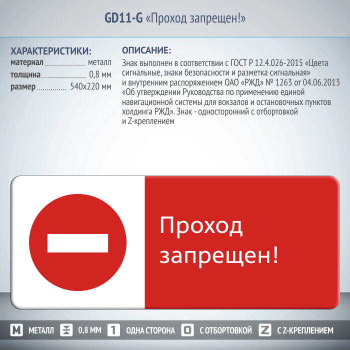 Знак «Проход запрещен!», GD11-G (односторонний горизонтальный, 540х220 мм, металл, с отбортовкой и Z-креплением) в Магнитогорске купить