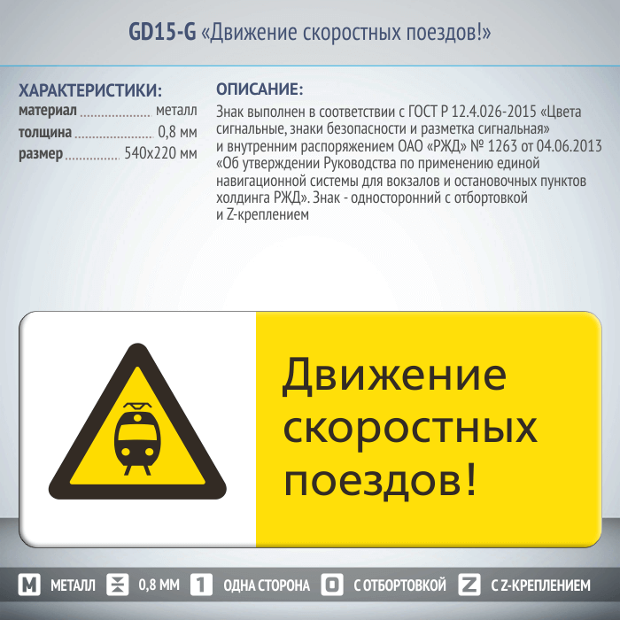 Знак «Движение скоростных поездов!», GD15-G (односторонний горизонтальный, 540х220 мм, металл, с отбортовкой и Z-креплением) в Магнитогорске купить
