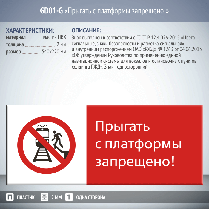 Знак «Прыгать с платформы запрещено!», GD01-G (односторонний горизонтальный, 540х220 мм, пластик 2 мм) в Магнитогорске купить