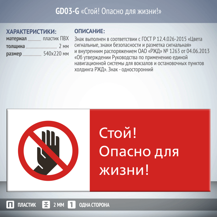 Знак «Стой! Опасно для жизни!», GD03-G (односторонний горизонтальный, 540х220 мм, пластик 2 мм) в Магнитогорске купить