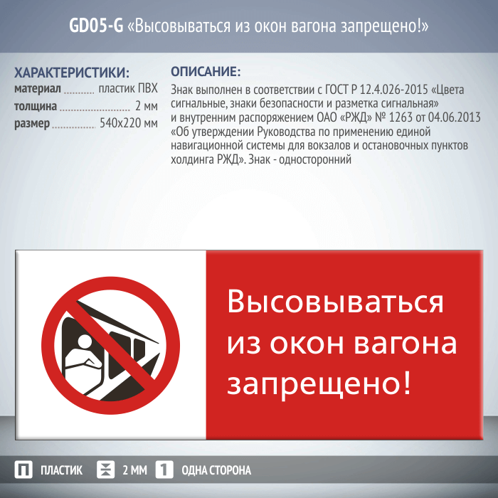 Знак «Высовываться из окон вагона запрещено!», GD05-G (односторонний горизонтальный, 540х220 мм, пластик 2 мм) в Магнитогорске купить