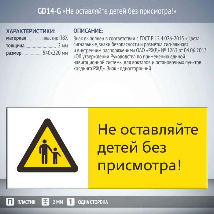 Знак «Не оставляйте детей без присмотра!», GD14-G (односторонний горизонтальный, 540х220 мм, пластик 2 мм) в Магнитогорске купить