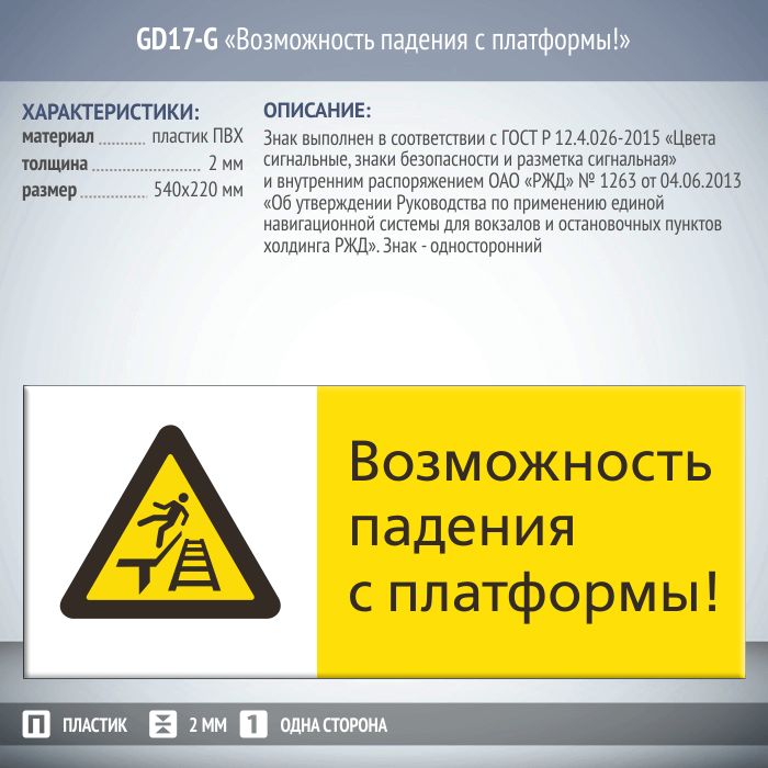 Знак «Возможность падения с платформы!», GD17-G (односторонний горизонтальный, 540х220 мм, пластик 2 мм) в Магнитогорске купить