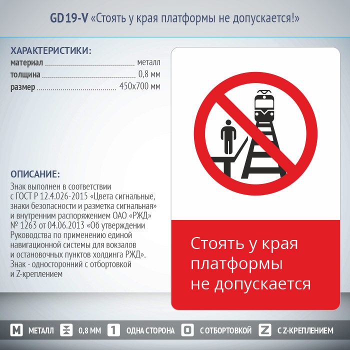 Знак «Стоять у края платформы не допускается!», GD19-V (односторонний вертикальный, 450х700 мм, металл, с отбортовкой и Z-креплением) в Магнитогорске купить