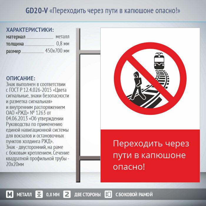 Знак «Переходить через пути в капюшоне опасно!», GD20-V (двусторонний вертикальный, 450х700 мм, металл, на раме с боковым креплением) в Магнитогорске купить