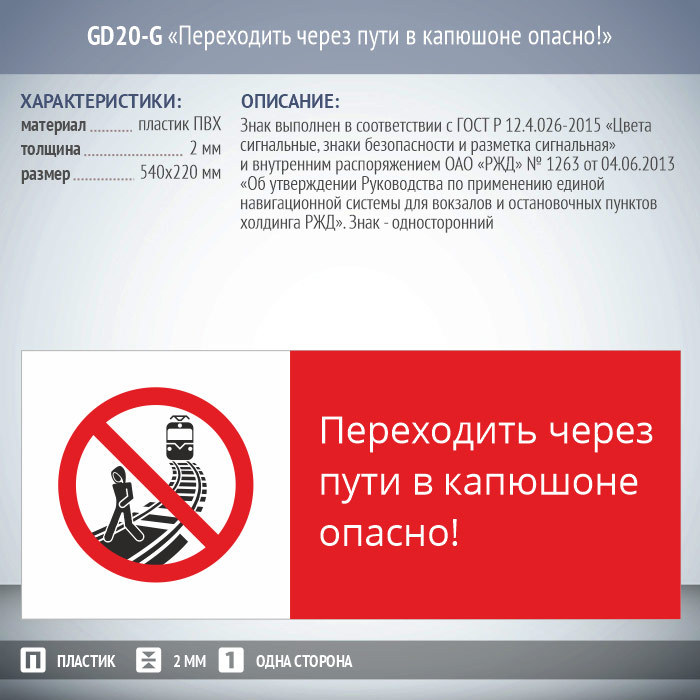 Знак «Переходить через пути в капюшоне опасно!», GD20-G (односторонний горизонтальный, 540х220 мм, пластик 2 мм) в Магнитогорске купить