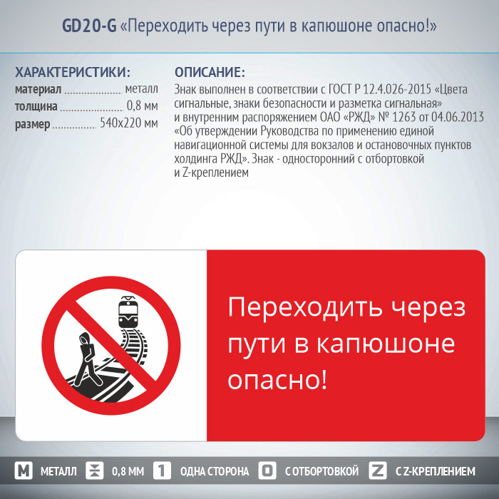 Знак «Переходить через пути в капюшоне опасно!», GD20-G (односторонний горизонтальный, 540х220 мм, металл, с отбортовкой и Z-креплением) в Магнитогорске купить