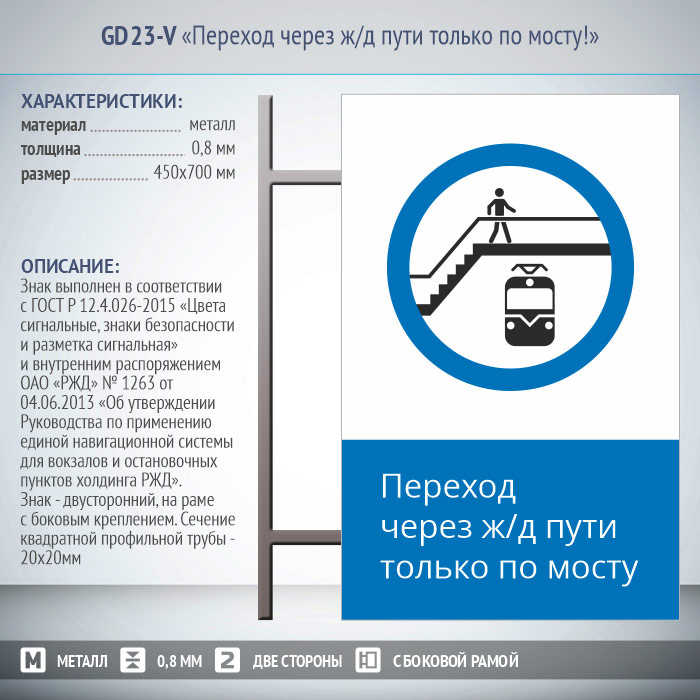 Знак «Переход через ж/д пути только по мосту!», GD23-V (двусторонний вертикальный, 450х700 мм, металл, на раме с боковым креплением) в Магнитогорске купить