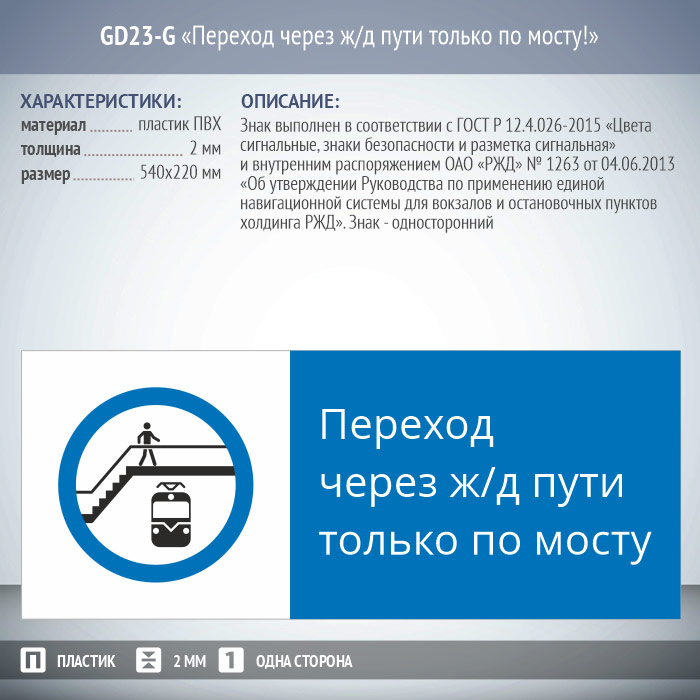 Знак «Переход через ж/д пути только по мосту!», GD23-G (односторонний горизонтальный, 540х220 мм, пластик 2 мм) в Магнитогорске купить