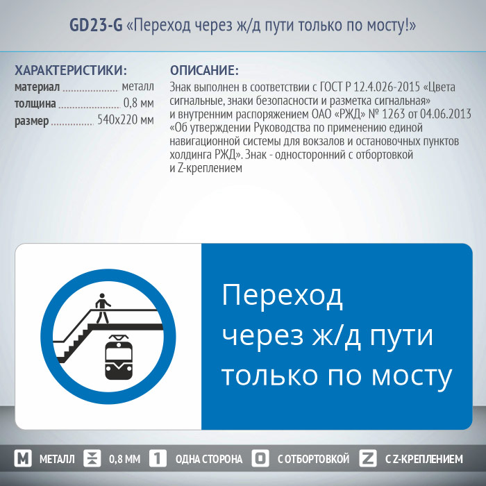 Знак «Переход через ж/д пути только по мосту!», GD23-G (односторонний горизонтальный, 540х220 мм, металл, с отбортовкой и Z-креплением) в Магнитогорске купить