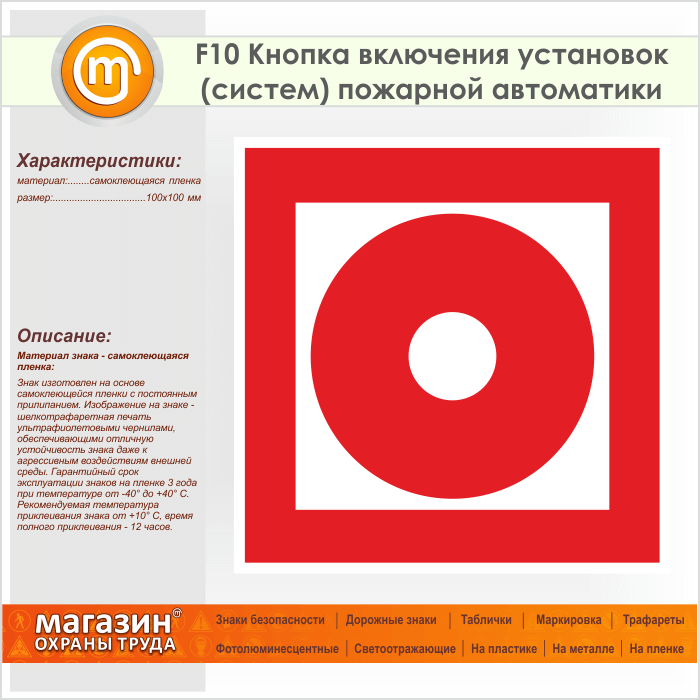 Знак F10 «Кнопка включения установок (систем) пожарной автоматики» (пленка, 100х100 мм) в Магнитогорске купить