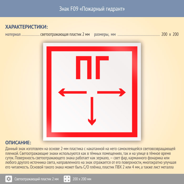 Знак F09 «Пожарный гидрант» (светоотражающий пластик, 200х200 мм) в Магнитогорске купить