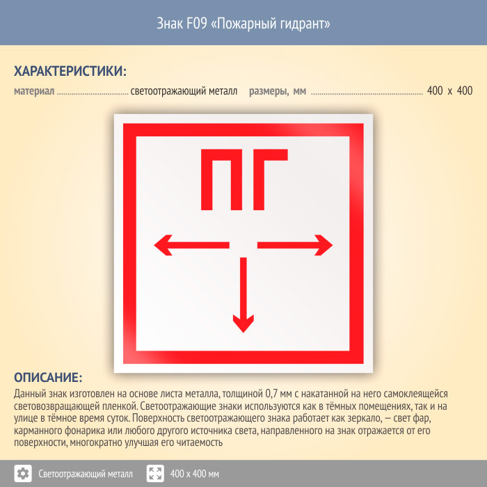 Знак F09 «Пожарный гидрант» (светоотражающий металл, 400х400 мм) в Магнитогорске купить