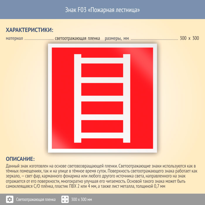 Знак F03 «Пожарная лестница» (светоотражающая пленка, 300х300 мм) в Магнитогорске купить