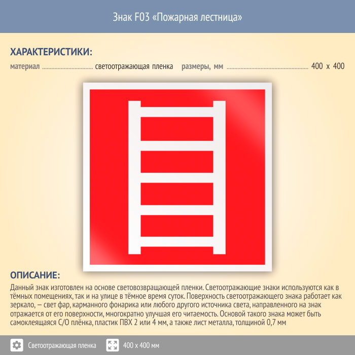 Знак F03 «Пожарная лестница» (светоотражающая пленка, 400х400 мм) в Магнитогорске купить