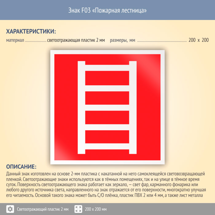 Знак F03 «Пожарная лестница» (светоотражающий пластик, 200х200 мм) в Магнитогорске купить