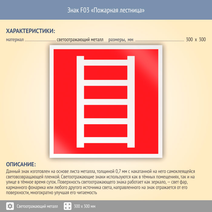 Знак F03 «Пожарная лестница» (светоотражающий металл, 300х300 мм) в Магнитогорске купить