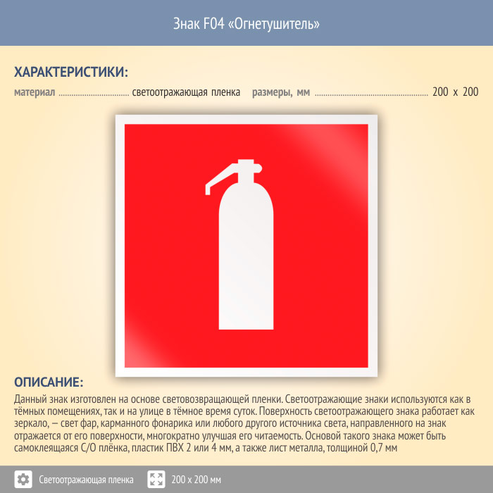 Знак F04 «Огнетушитель» (светоотражающая пленка, 200х200 мм) в Магнитогорске купить
