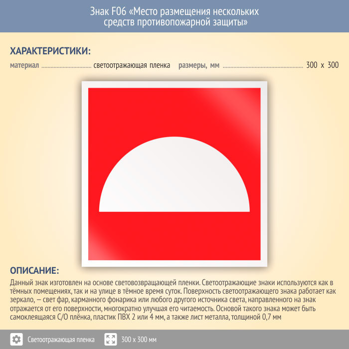 Знак F06 «Место размещения нескольких средств противопожарной защиты» (светоотражающая пленка, 300х300 мм) в Магнитогорске купить