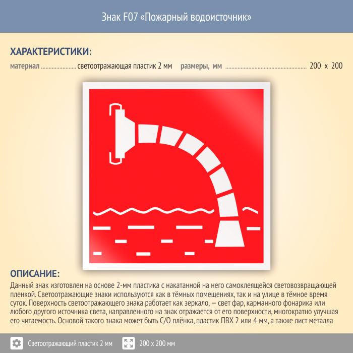 Знак F07 «Пожарный водоисточник» (светоотражающий пластик, 200х200 мм) в Магнитогорске купить