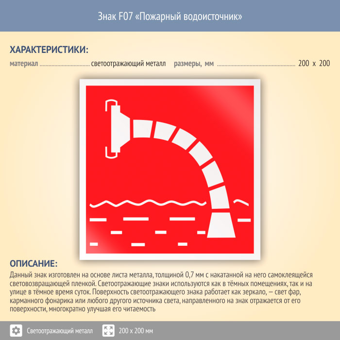 Знак F07 «Пожарный водоисточник» (светоотражающий металл, 200х200 мм) в Магнитогорске купить