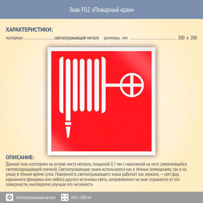 Знак F02 «Пожарный кран» (светоотражающий металл, 200х200 мм) в Магнитогорске купить
