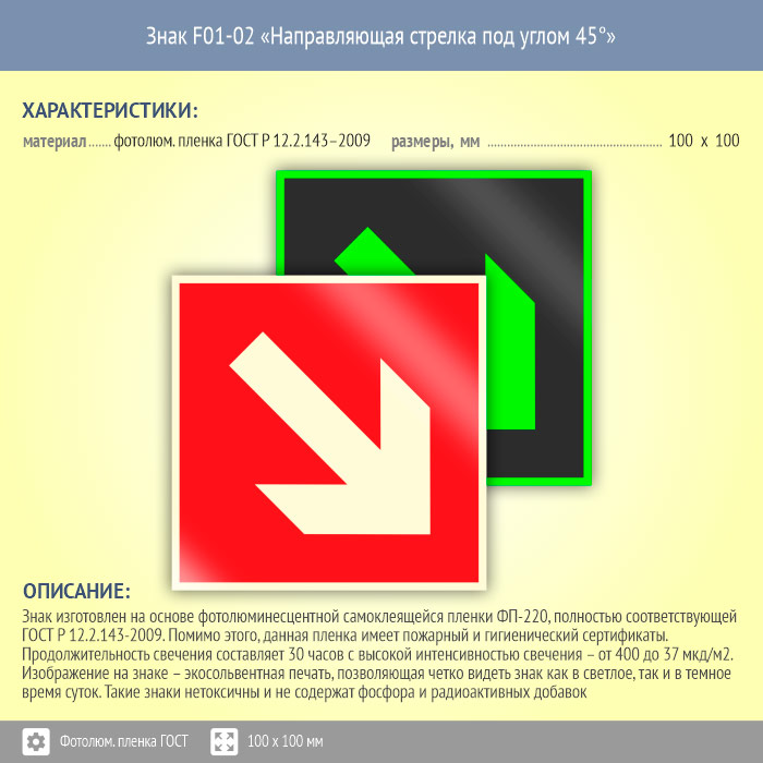 Знак F01-02 «Направляющая стрелка под углом 45°» (фотолюминесцентная пленка ГОСТ 34428-2018, 100х100 мм) в Магнитогорске купить
