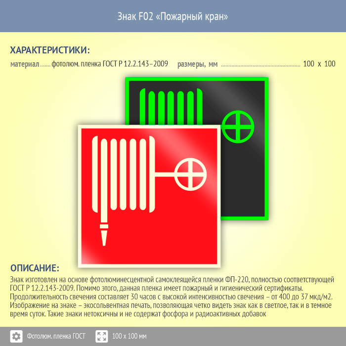 Знак F02 «Пожарный кран» (фотолюминесцентная пленка ГОСТ 34428-2018, 100х100 мм) в Магнитогорске купить