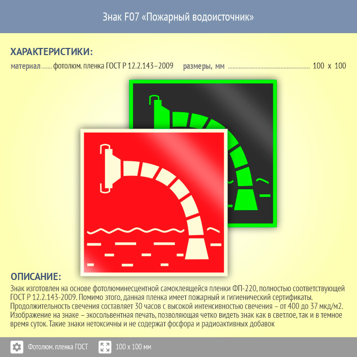 Знак F07 «Пожарный водоисточник» (фотолюминесцентная пленка ГОСТ 34428-2018, 100х100 мм) в Магнитогорске купить