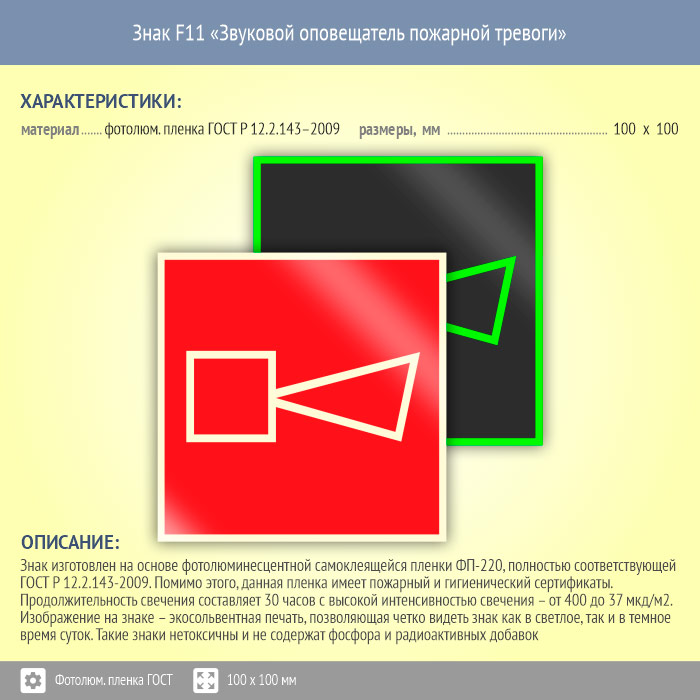 Знак F11 «Звуковой оповещатель пожарной тревоги» (фотолюминесцентная пленка ГОСТ 34428-2018, 100х100 мм) в Магнитогорске купить