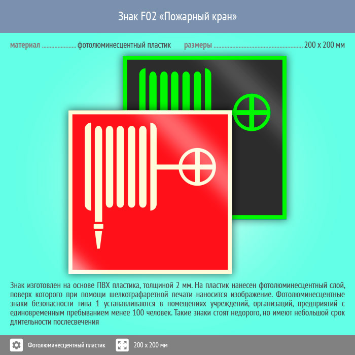 Знак F02 «Пожарный кран» (фотолюминесцентный пластик, 200х200 мм) в Магнитогорске купить