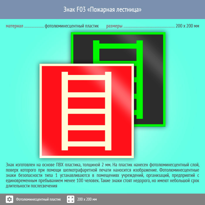 Знак F03 «Пожарная лестница» (фотолюминесцентный пластик, 200х200 мм) в Магнитогорске купить
