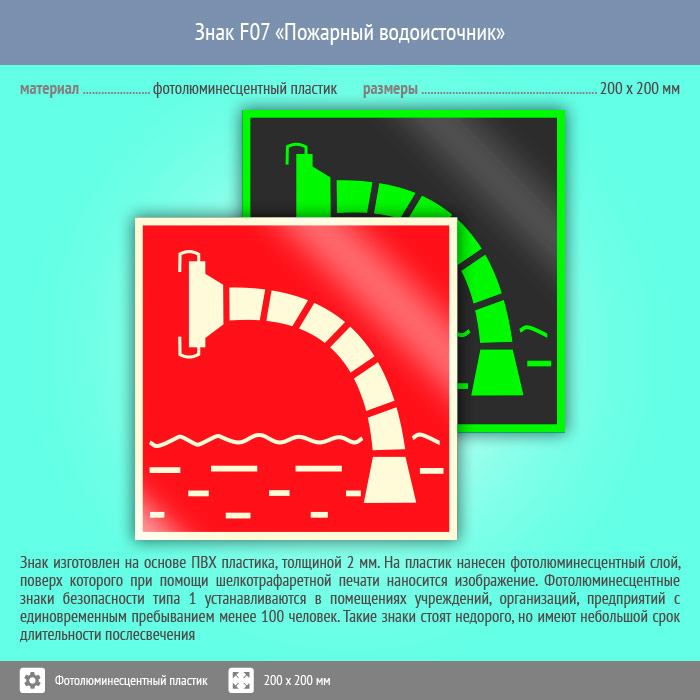 Знак F07 «Пожарный водоисточник» (фотолюминесцентный пластик, 200х200 мм) в Магнитогорске купить