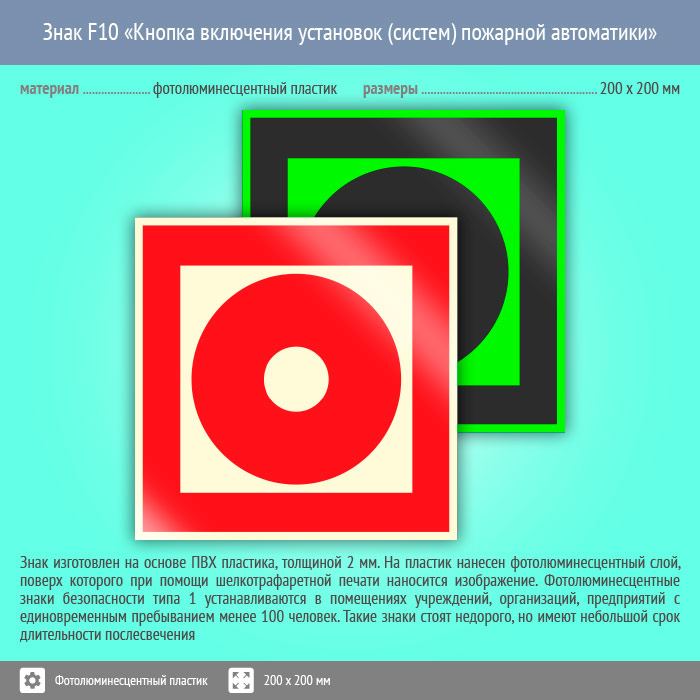 Знак F10 «Кнопка включения установок (систем) пожарной автоматики» (фотолюминесцентный пластик, 200х200 мм) в Магнитогорске купить