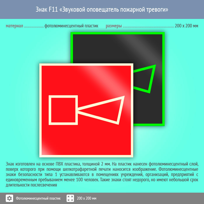 Знак F11 «Звуковой оповещатель пожарной тревоги» (фотолюминесцентный пластик, 200х200 мм) в Магнитогорске купить