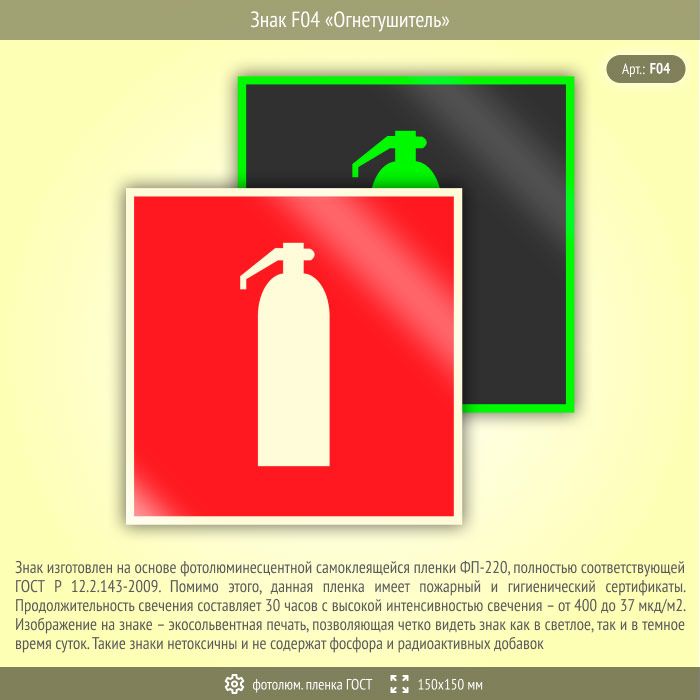 Знак F04 «Огнетушитель» (фотолюминесцентная пленка ГОСТ 34428-2018, 150х150 мм) в Магнитогорске купить