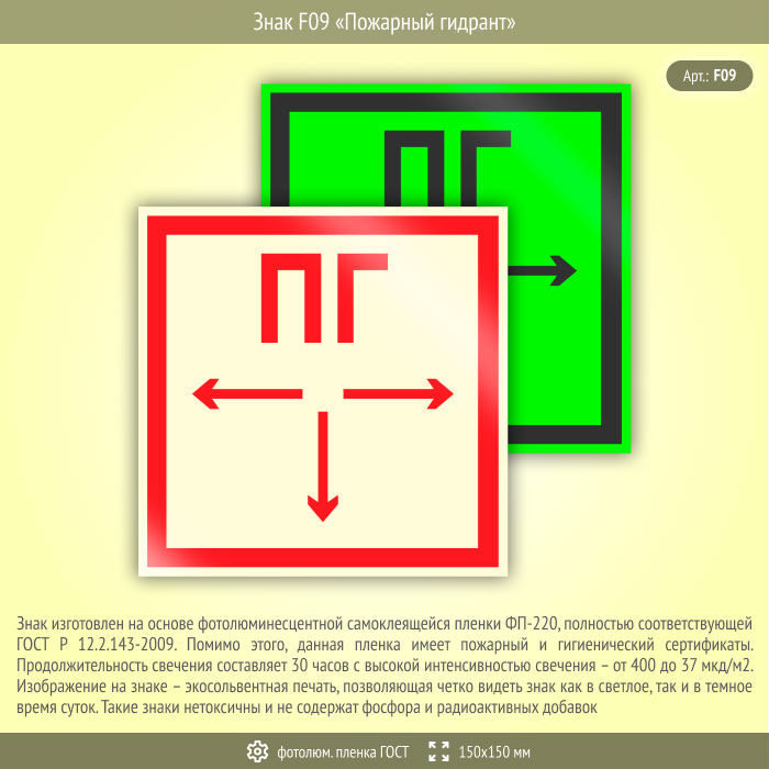 Знак F09 «Пожарный гидрант» (фотолюминесцентная пленка ГОСТ 34428-2018, 150х150 мм) в Магнитогорске купить