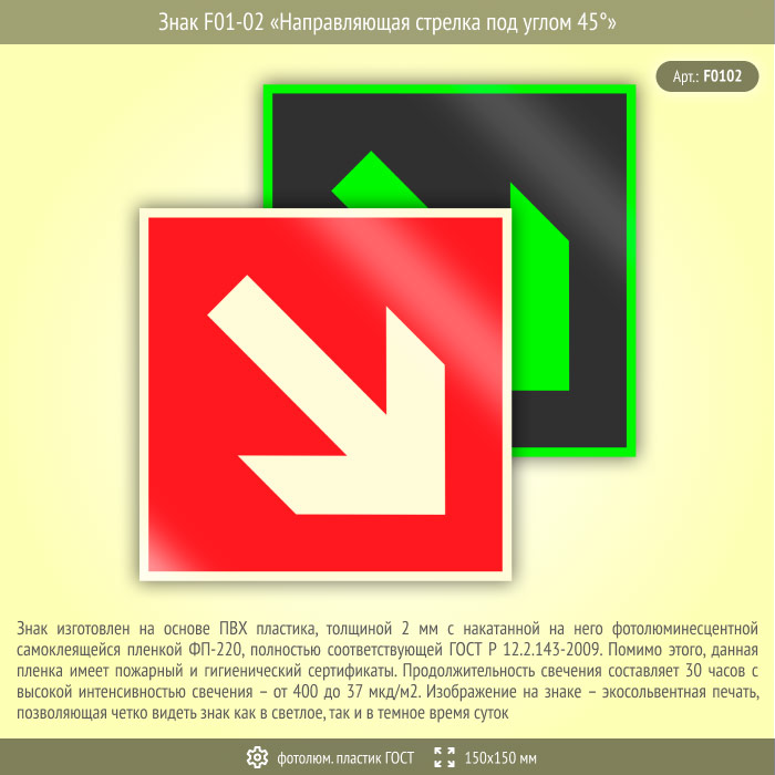 Знак F01-02 «Направляющая стрелка под углом 45°» (фотолюминесцентный пластик ГОСТ 34428-2018, 150х150 мм) в Магнитогорске купить