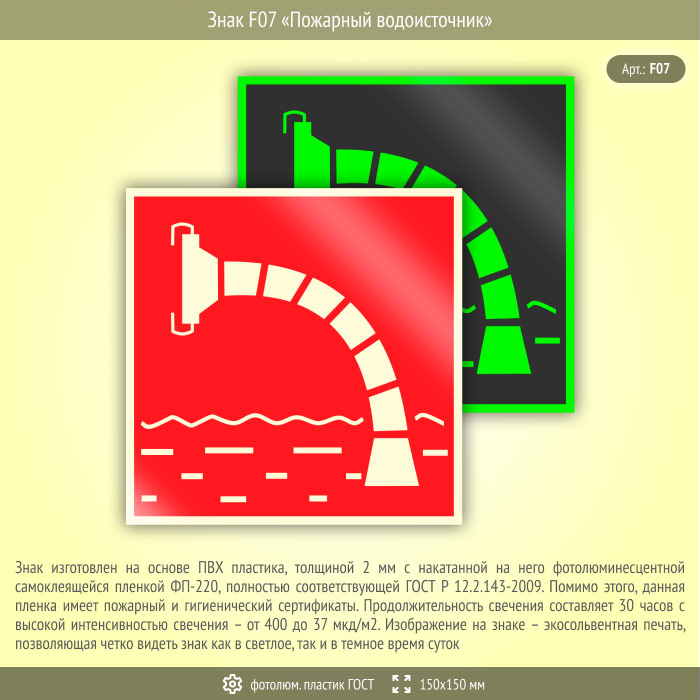 Знак F07 «Пожарный водоисточник» (фотолюминесцентный пластик ГОСТ 34428-2018, 150х150 мм) в Магнитогорске купить