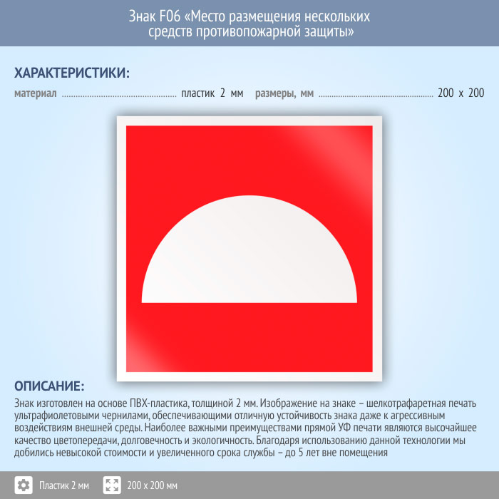 Знак F06 «Место размещения нескольких средств противопожарной защиты» (пластик, 200х200 мм) в Магнитогорске купить