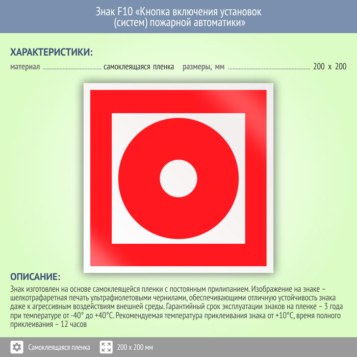 Знак F10 «Кнопка включения установок (систем) пожарной автоматики» (пленка, 200х200 мм) в Магнитогорске купить
