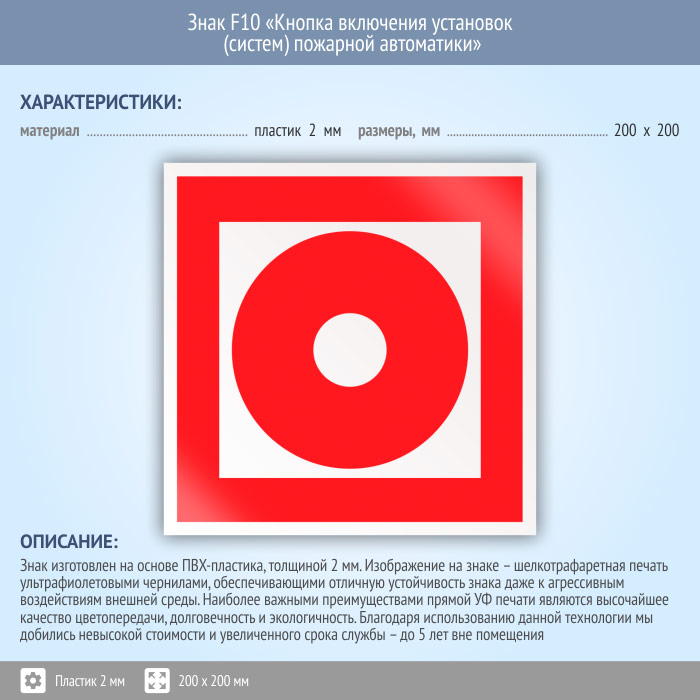 Знак F10 «Кнопка включения установок (систем) пожарной автоматики» (пластик, 200х200 мм) в Магнитогорске купить