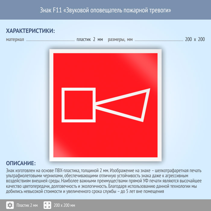 Знак F11 «Звуковой оповещатель пожарной тревоги» (пластик, 200х200 мм) в Магнитогорске купить