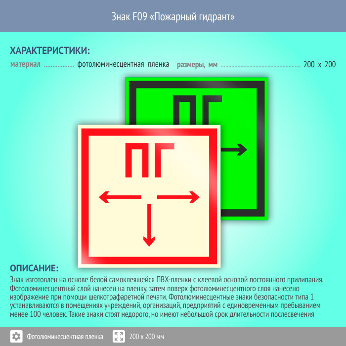 Знак F09 «Пожарный гидрант» (фотолюминесцентная пленка, 200х200 мм) в Магнитогорске купить