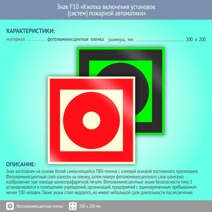 Знак F10 «Кнопка включения установок (систем) пожарной автоматики» (фотолюминесцентная пленка, 200х200 мм) в Магнитогорске купить