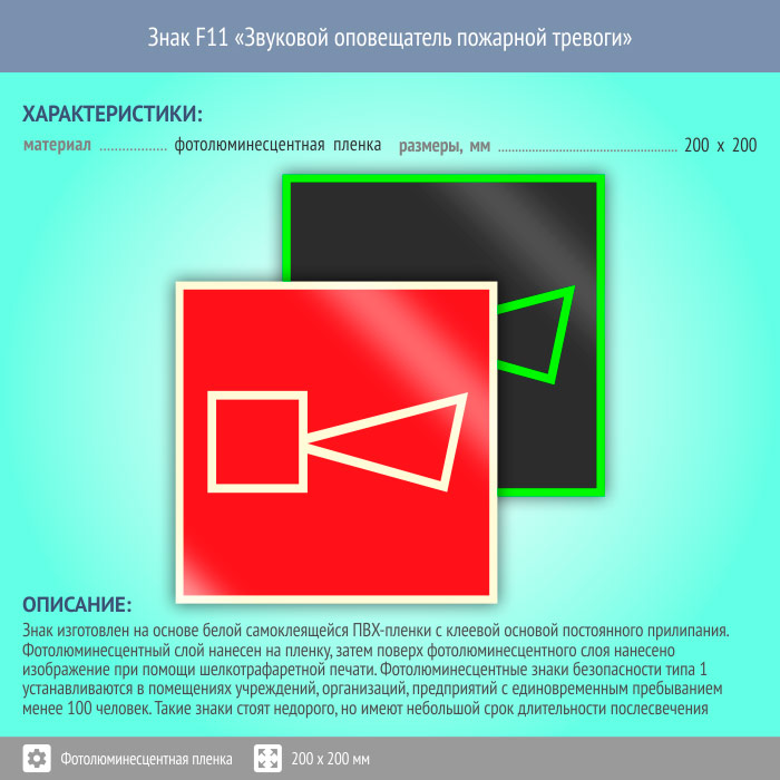 Знак F11 «Звуковой оповещатель пожарной тревоги» (фотолюминесцентная пленка, 200х200 мм) в Магнитогорске купить