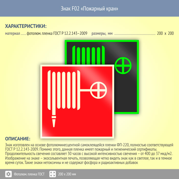 Знак F02 «Пожарный кран» (фотолюминесцентная пленка ГОСТ 34428-2018, 200х200 мм) в Магнитогорске купить
