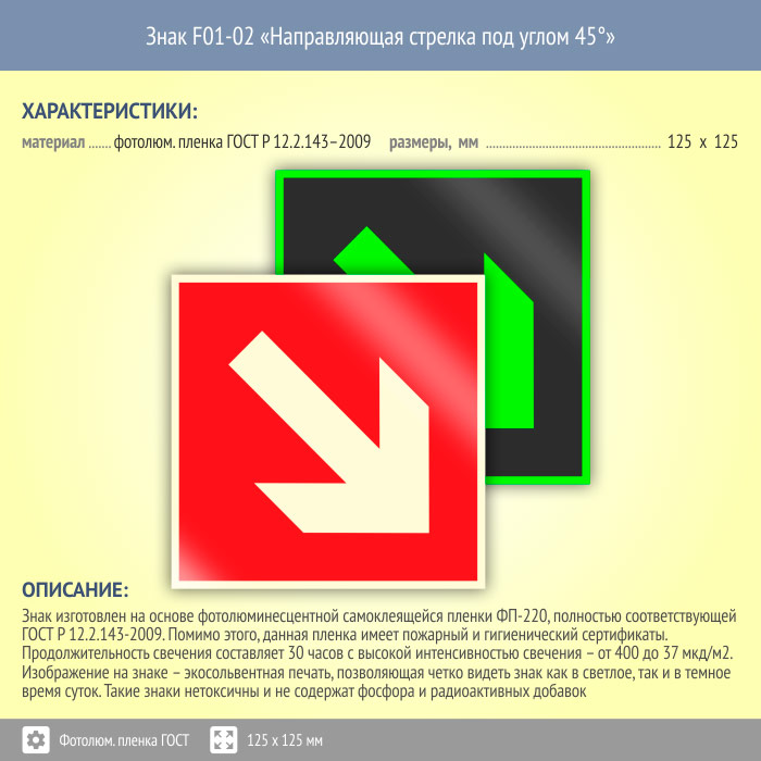 Знак F01-02 «Направляющая стрелка под углом 45°» (фотолюминесцентная пленка ГОСТ 34428-2018, 125х125 мм) в Магнитогорске купить