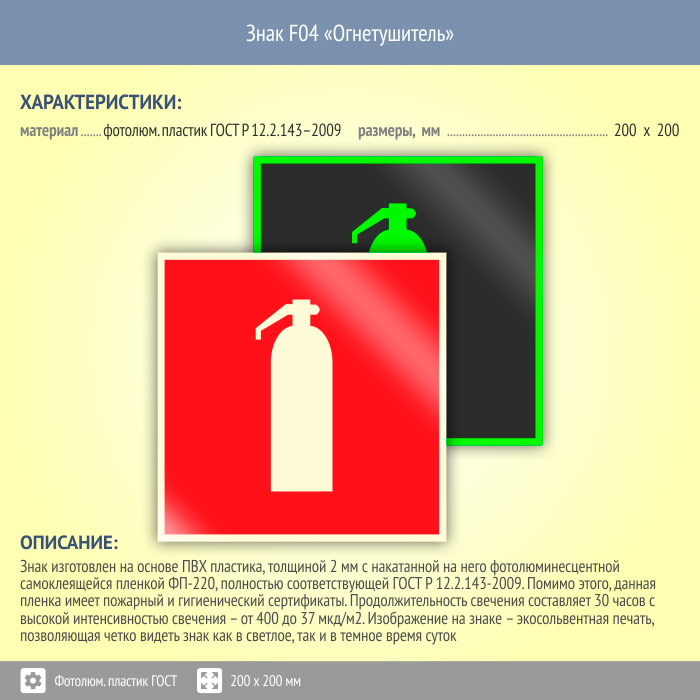 Знак F04 «Огнетушитель» (фотолюминесцентный пластик ГОСТ 34428-2018, 200х200 мм) в Магнитогорске купить
