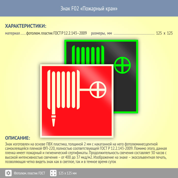 Знак F02 «Пожарный кран» (фотолюминесцентный пластик ГОСТ 34428-2018, 125х125 мм) в Магнитогорске купить